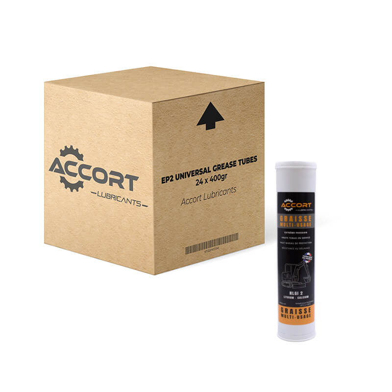 Accort® Lubricants Multipurpose EP2 Universal Grease, afzonderlijk of in dozen van 24 stuks verkrijgbaar, stelt u in staat alle soorten onderdelen op uw bouwplaatsen te smeren (rubberen rupsbanden, kettingwielen, loopwielen, pennen en bussen...). Hoog beschermingsniveau.